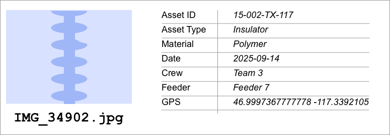 Ensure inspection images are geo-tagged (GPS coordinates and, where possible, altitude and orientation). Spatial context allows images to be reliably associated with assets later — even when filenames, folders, or vendors change.